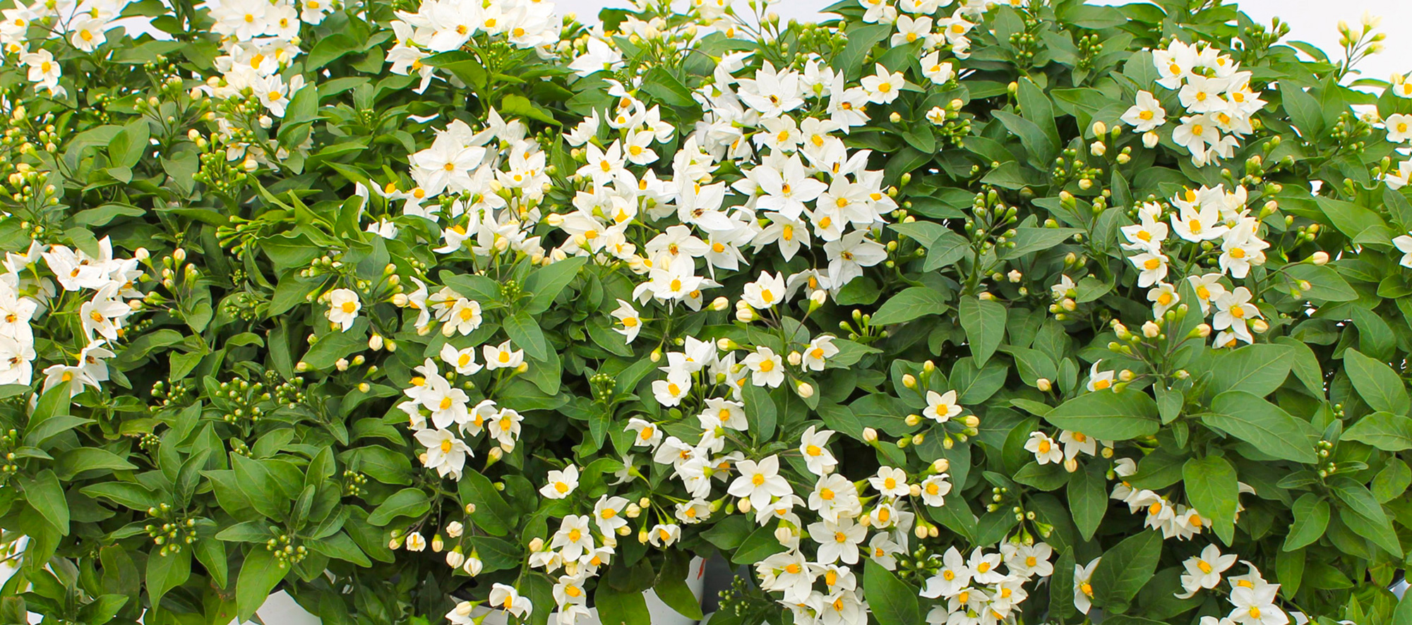 Unser Sortiment umfasst eine beeindruckende Vielfalt an Solanum jasminoides, Lantana camara und Lycianthes rantonnetii in verschiedenen Größen und Formen, von 12 cm Töpfen über Ampeln, Büsche, Pyramiden, Spaliere, Stämme bis hin zu Bögen – perfekt für jede Gartengestaltung.